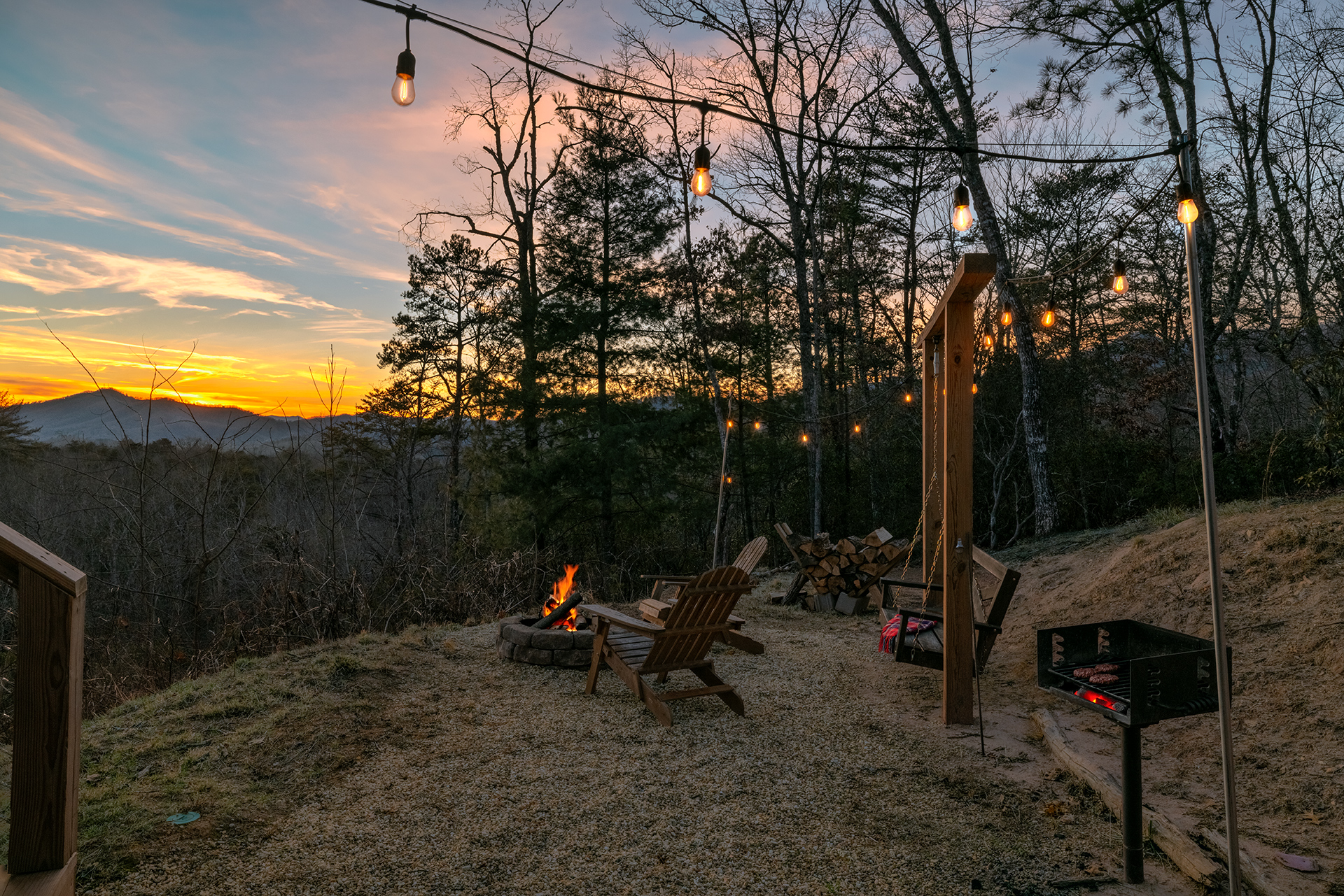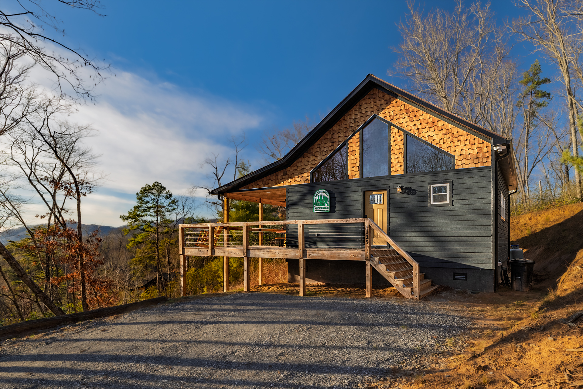 As you arrive, you’ll be greeted by spectacular long-range mountain views stretching across the horizon. A parking area for up to two vehicles sits just steps from the cabin entrance, making unloading luggage and groceries simple. The spacious deck is where this cabin truly shines. Floor-to-ceiling views span the entire back of the home, giving you front-row seats to sunsets over the Smoky Mountain top views, passing wildlife, and breathtaking nighttime skies. Rocking chairs provide the perfect spot for morning coffee, while the bubbling hot tub invites you to relax under a canopy of stars after a day of searching the smoky mountains for the cabin's namesake. The surrounding wooded landscape offers excellent privacy and a quiet, serene atmosphere that is ideal for guests traveling with dogs, who will love the fresh mountain air and space too. (Always keep dogs leashed when outside or on deck as neither is fenced.)