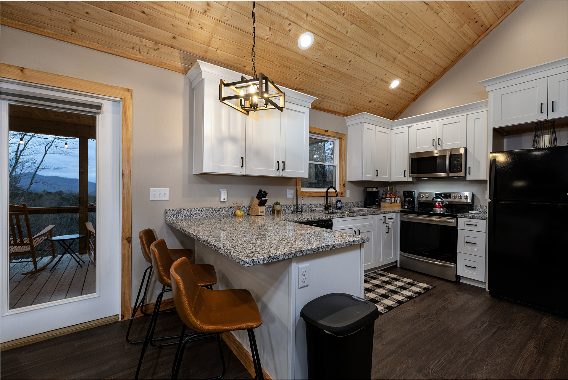 Step inside to an inviting open-concept layout designed to make every moment of your stay feel comfortable and connected. The living room features soaring ceilings, abundant natural light, and massive picture windows that frame the mountain views. A cozy gas fireplace is the heart of the space, creating a warm ambiance on crisp mountain mornings or quiet evenings indoors. A large smart TV is available for streaming with your personal accounts. The adjacent kitchen is fully equipped with everything you need for preparing meals, from easy breakfasts to relaxed dinners enjoyed out on the deck. With modern appliances, ample counter space, and beautiful natural light, it’s a cheerful spot to gather and recharge.