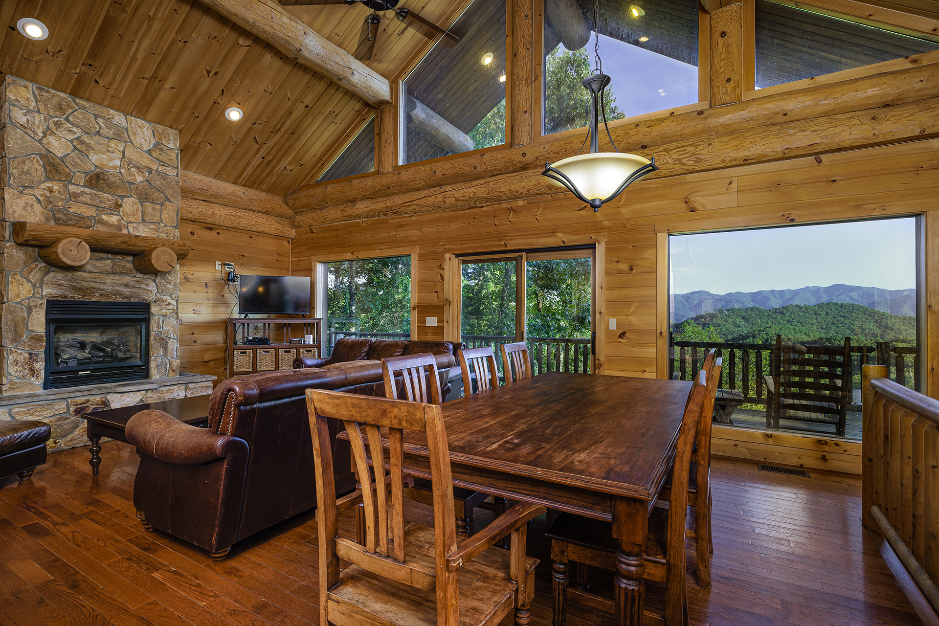 When you arrive at Ridge Runner you will park in the circular gravel driveway next to the cabin. You can pull up next to a set of stairs leading to the main deck and entrance. Here is where your journey to Ridge Runner becomes worth any and every effort, for; as you step on to the large deck the natural beautiful of the Smoky Mountains surrounds you. This natural mountain setting seems to fill every part of this cabin, exterior and interior. The entrance is under a covered porch when you walk up the stairs. The large wrap-around deck is the primary spot for outdoor activities. There is a stone fire pit on the front lawn. A picnic table is positioned around the corner from the entrance to the kitchen, just outside of the sliding glass doors in the living room. There are several rocking chairs on the deck that provide you with a relaxing spot to drink your morning cup of coffee or evening glass of wine and take in the tranquil surroundings of the woods. A gas grill and all utensils is provided for BBQ connoisseurs (full propane tank included). The lower deck wraps around the front and sides of the cabin. There are several more rocking chairs as well as the hot tub. The deck can be accessed from the game room and the king bedroom on the lower level. This is an ideal spot to relax after a long day of enjoying the outdoors and watch the kids make s'mores in the stone fire pit below. The exterior of this beautiful smoky mountain log cabin offers as much to do as the interior.