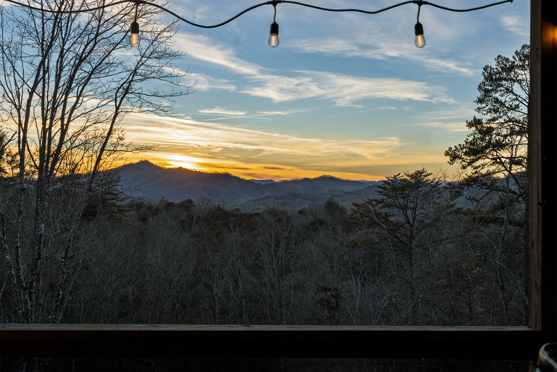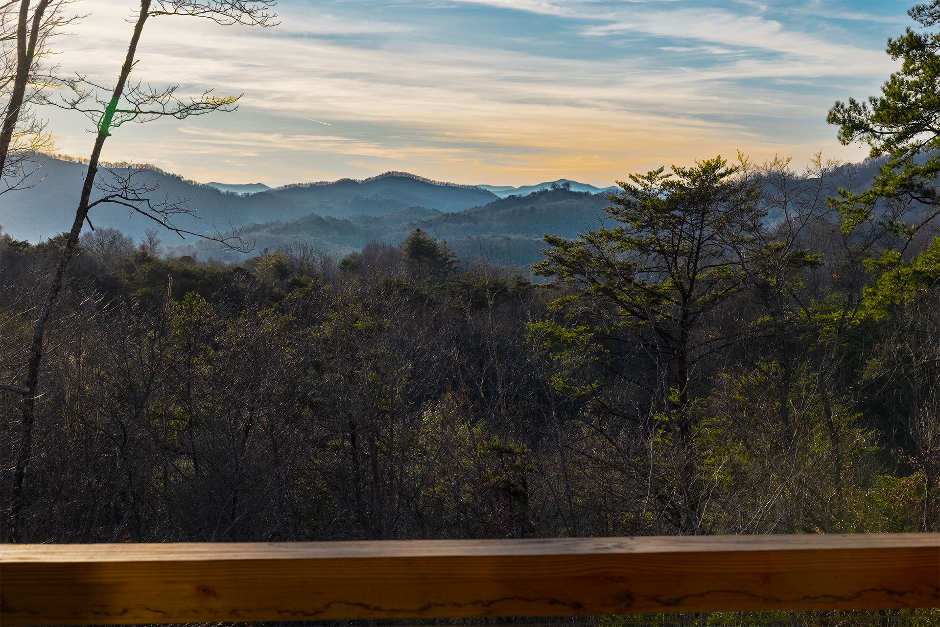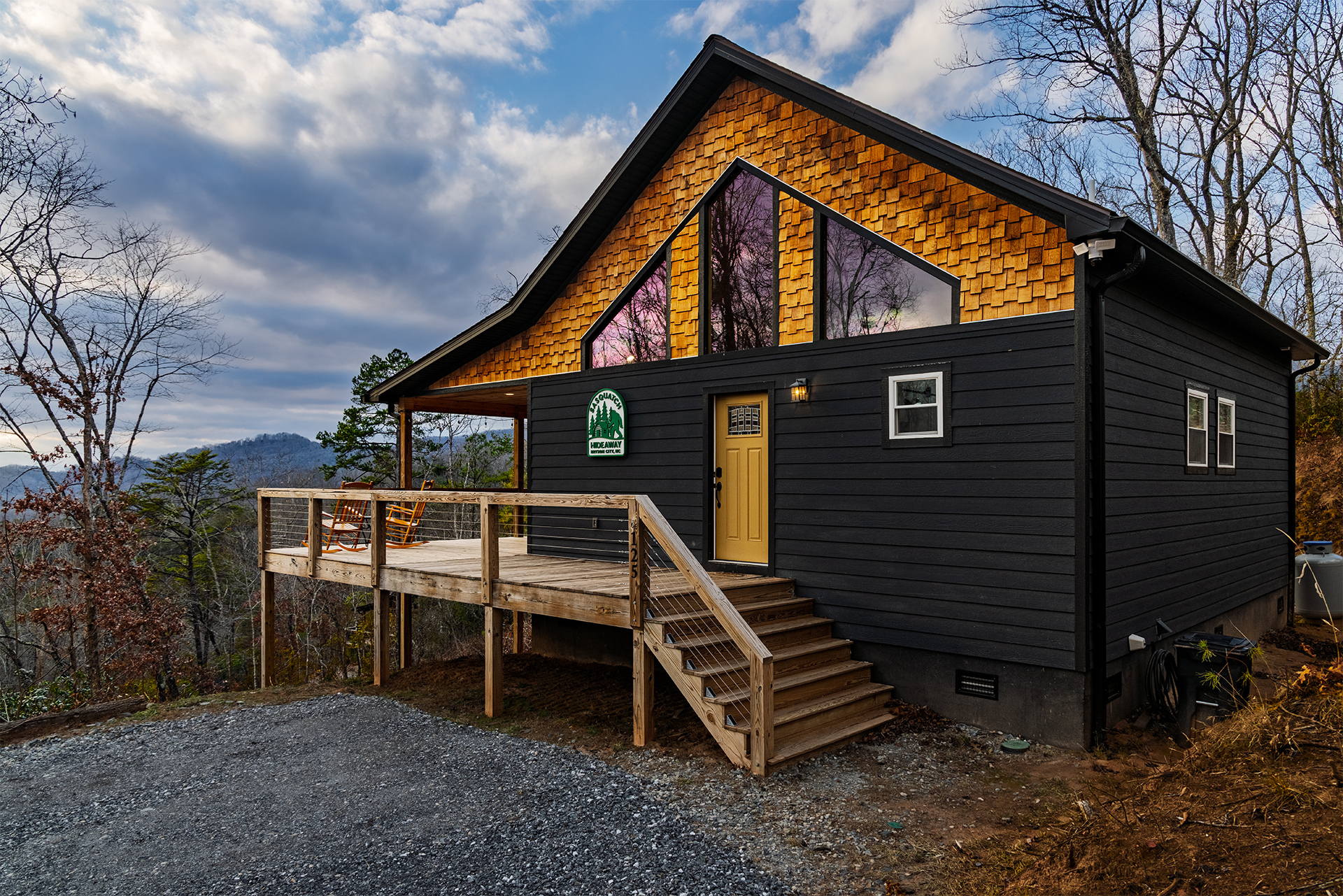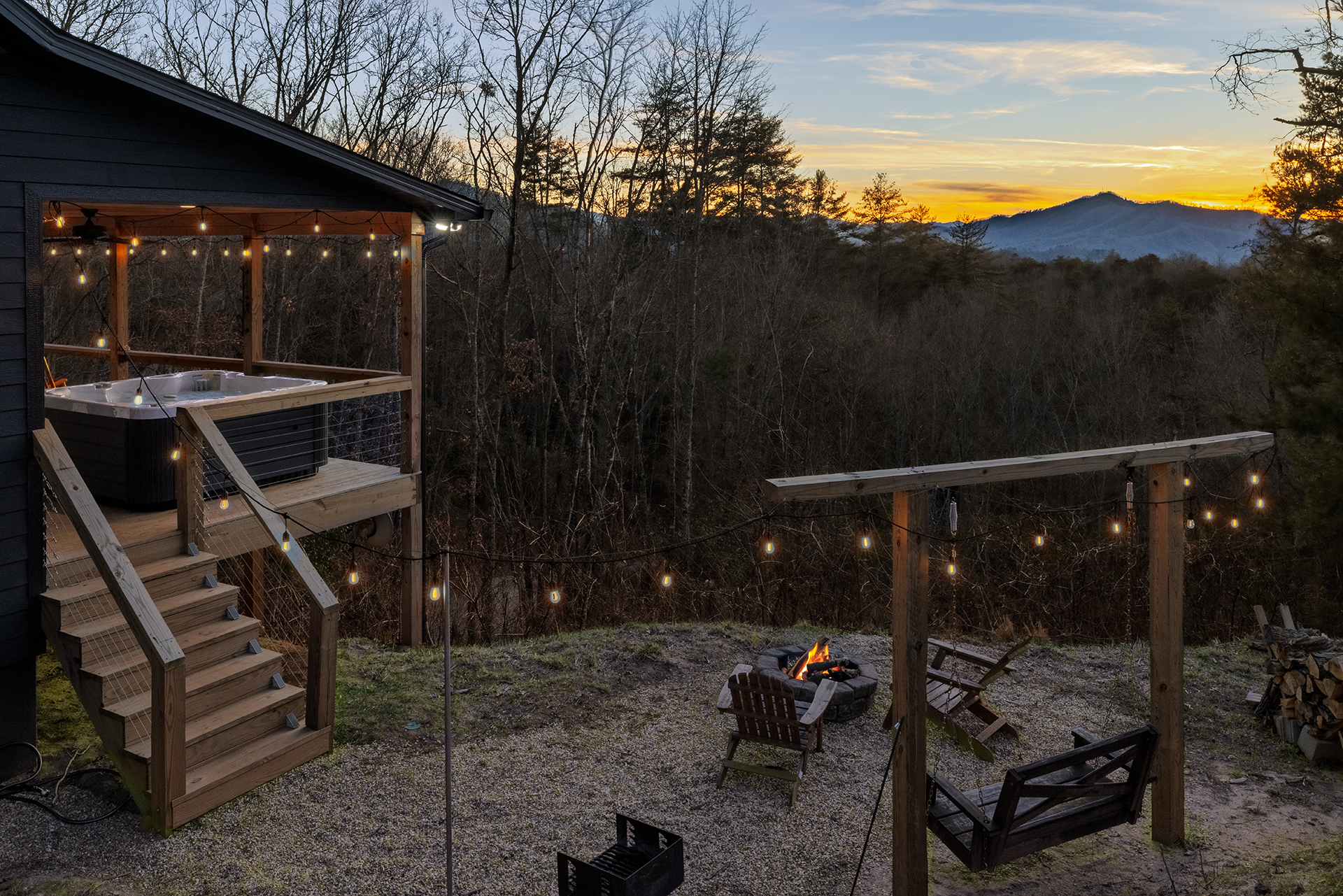 As you arrive, you’ll be greeted by spectacular long-range mountain views stretching across the horizon. A parking area for up to two vehicles sits just steps from the cabin entrance, making unloading luggage and groceries simple. The spacious deck is where this cabin truly shines. Floor-to-ceiling views span the entire back of the home, giving you front-row seats to sunsets over the Smoky Mountain top views, passing wildlife, and breathtaking nighttime skies. Rocking chairs provide the perfect spot for morning coffee, while the bubbling hot tub invites you to relax under a canopy of stars after a day of searching the smoky mountains for the cabin's namesake. The surrounding wooded landscape offers excellent privacy and a quiet, serene atmosphere that is ideal for guests traveling with dogs, who will love the fresh mountain air and space too. (Always keep dogs leashed when outside or on deck as neither is fenced.)