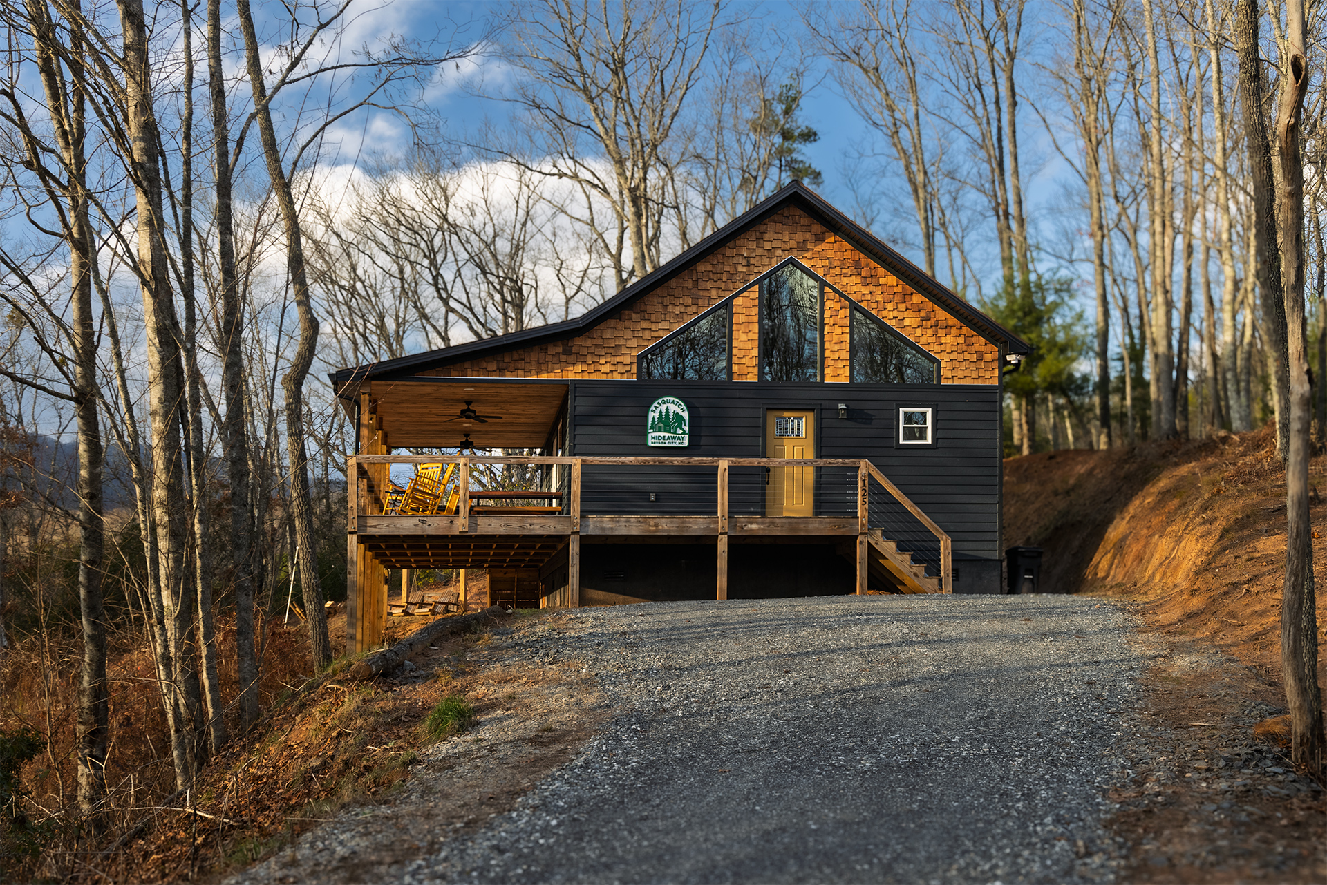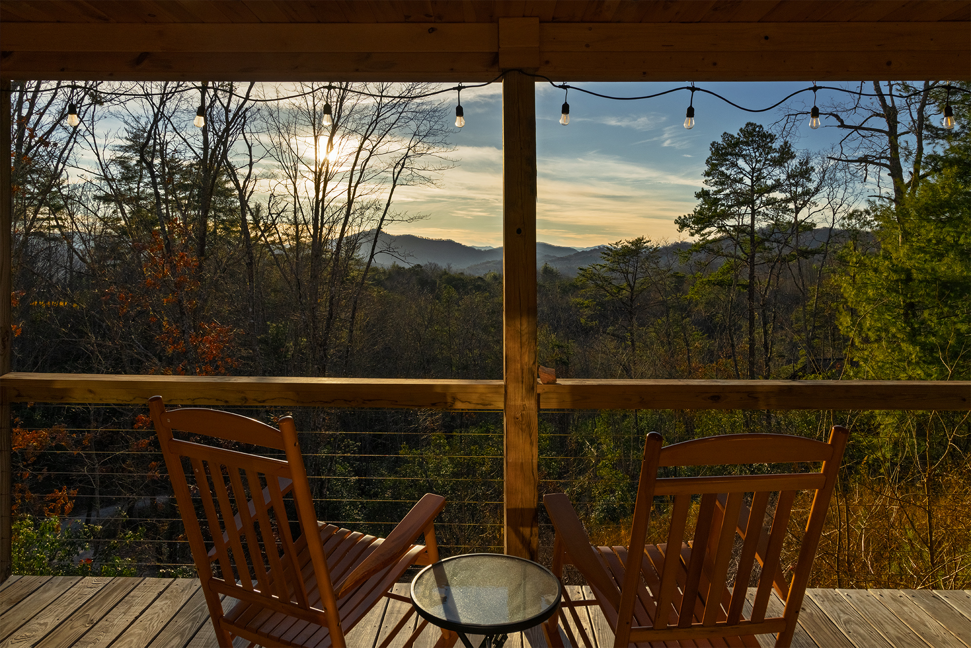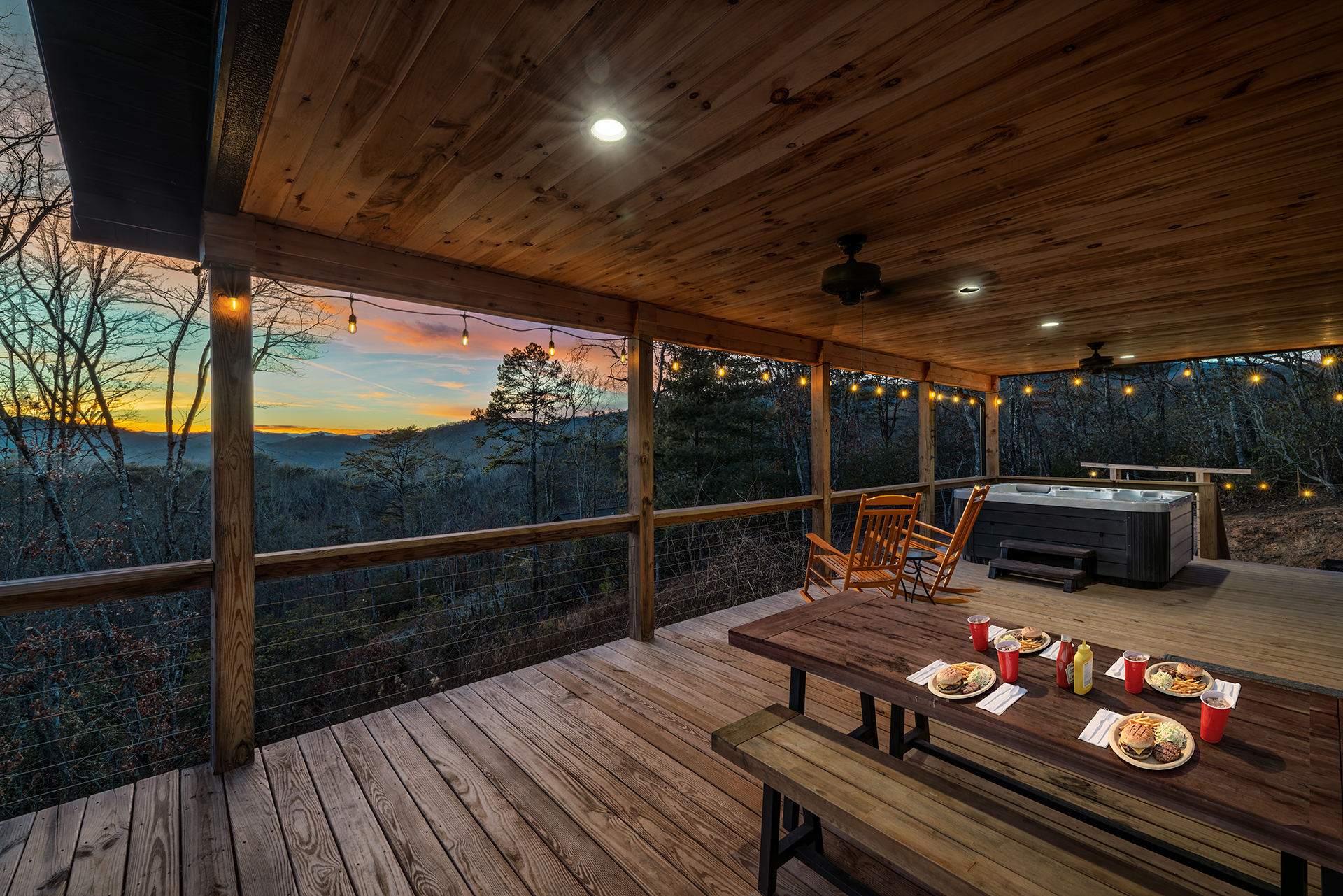 As you arrive, you’ll be greeted by spectacular long-range mountain views stretching across the horizon. A parking area for up to two vehicles sits just steps from the cabin entrance, making unloading luggage and groceries simple. The spacious deck is where this cabin truly shines. Floor-to-ceiling views span the entire back of the home, giving you front-row seats to sunsets over the Smoky Mountain top views, passing wildlife, and breathtaking nighttime skies. Rocking chairs provide the perfect spot for morning coffee, while the bubbling hot tub invites you to relax under a canopy of stars after a day of searching the smoky mountains for the cabin's namesake. The surrounding wooded landscape offers excellent privacy and a quiet, serene atmosphere that is ideal for guests traveling with dogs, who will love the fresh mountain air and space too. (Always keep dogs leashed when outside or on deck as neither is fenced.)