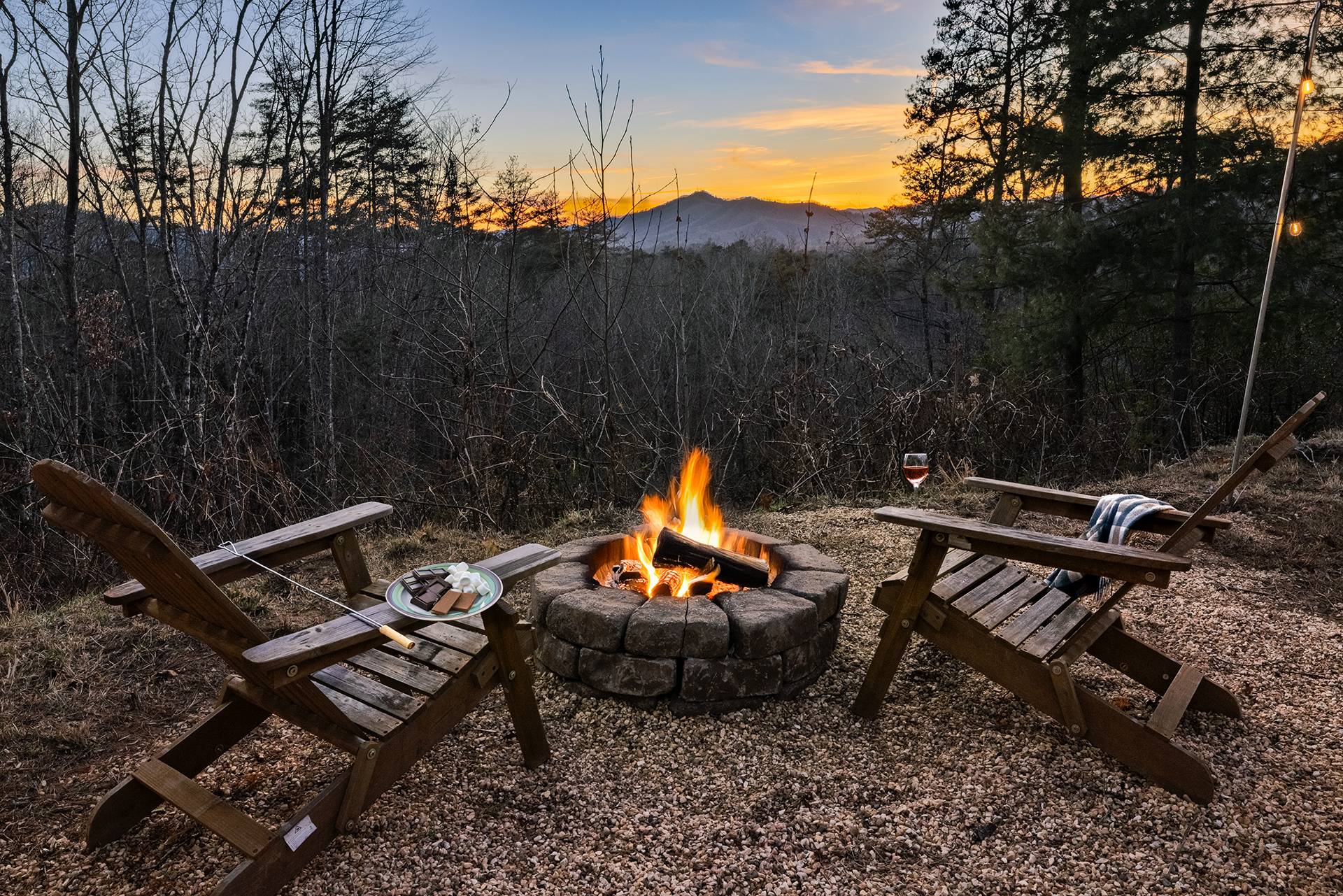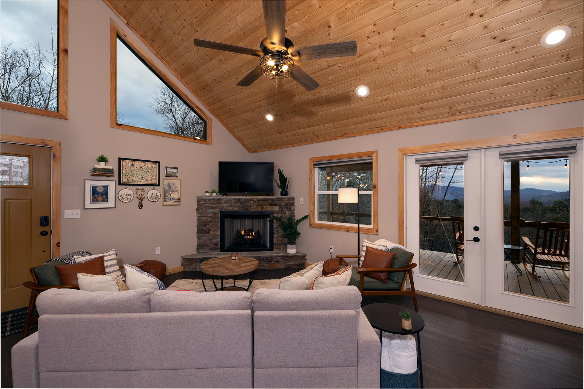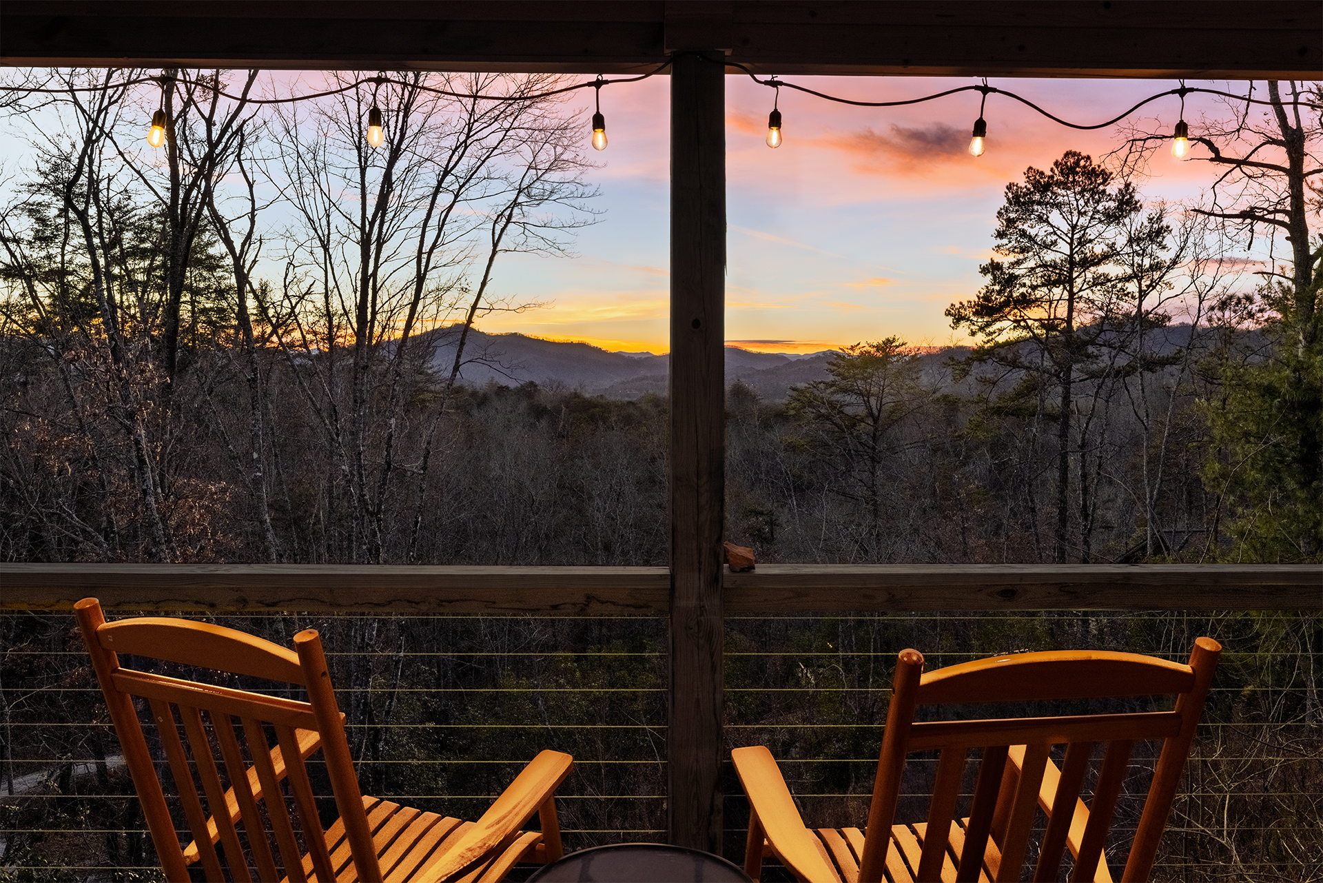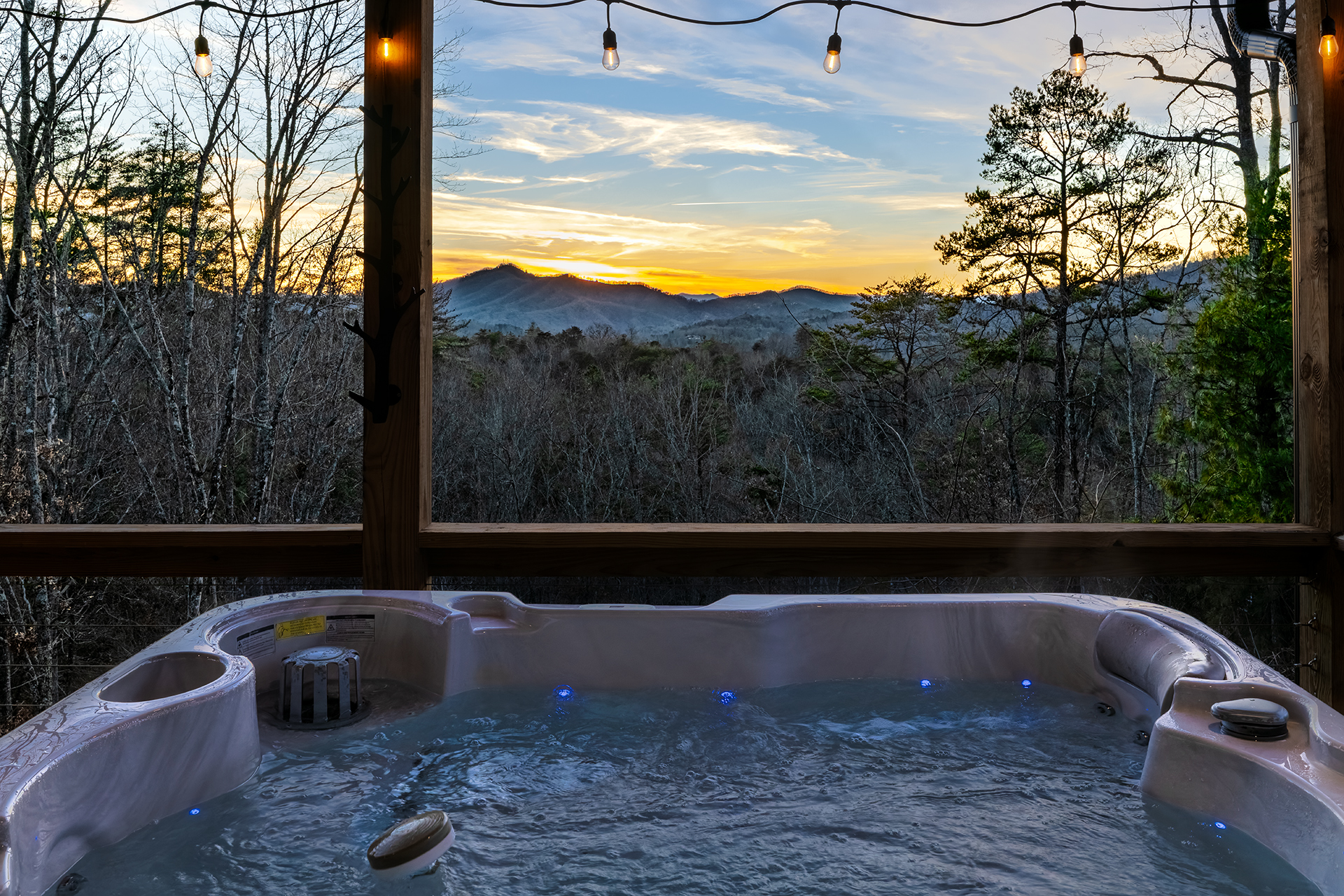 As you arrive, you’ll be greeted by spectacular long-range mountain views stretching across the horizon. A parking area for up to two vehicles sits just steps from the cabin entrance, making unloading luggage and groceries simple. The spacious deck is where this cabin truly shines. Floor-to-ceiling views span the entire back of the home, giving you front-row seats to sunsets over the Smoky Mountain top views, passing wildlife, and breathtaking nighttime skies. Rocking chairs provide the perfect spot for morning coffee, while the bubbling hot tub invites you to relax under a canopy of stars after a day of searching the smoky mountains for the cabin's namesake. The surrounding wooded landscape offers excellent privacy and a quiet, serene atmosphere that is ideal for guests traveling with dogs, who will love the fresh mountain air and space too. (Always keep dogs leashed when outside or on deck as neither is fenced.)