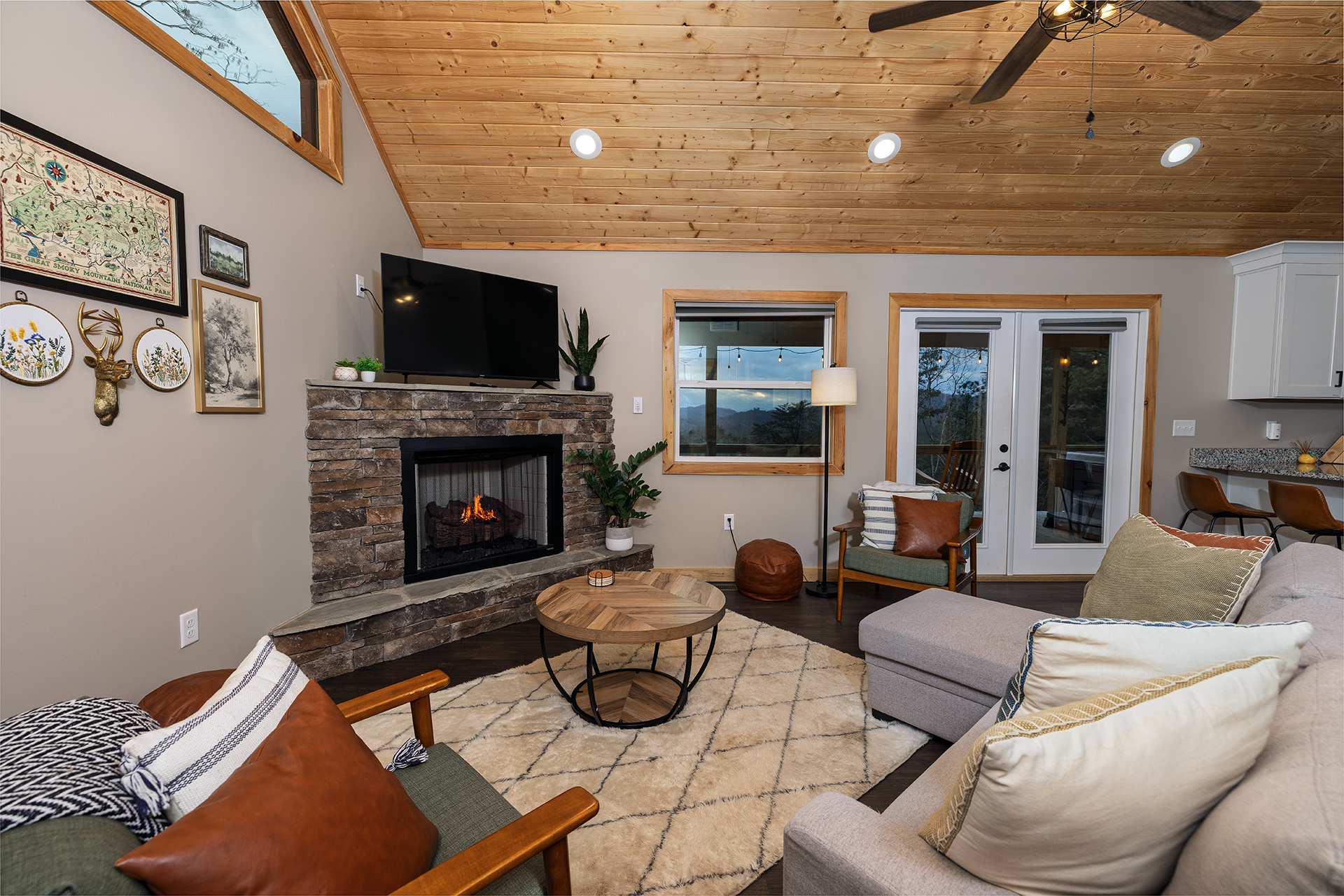 Step inside to an inviting open-concept layout designed to make every moment of your stay feel comfortable and connected. The living room features soaring ceilings, abundant natural light, and massive picture windows that frame the mountain views. A cozy gas fireplace is the heart of the space, creating a warm ambiance on crisp mountain mornings or quiet evenings indoors. A large smart TV is available for streaming with your personal accounts. The adjacent kitchen is fully equipped with everything you need for preparing meals, from easy breakfasts to relaxed dinners enjoyed out on the deck. With modern appliances, ample counter space, and beautiful natural light, it’s a cheerful spot to gather and recharge.