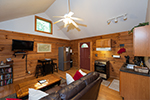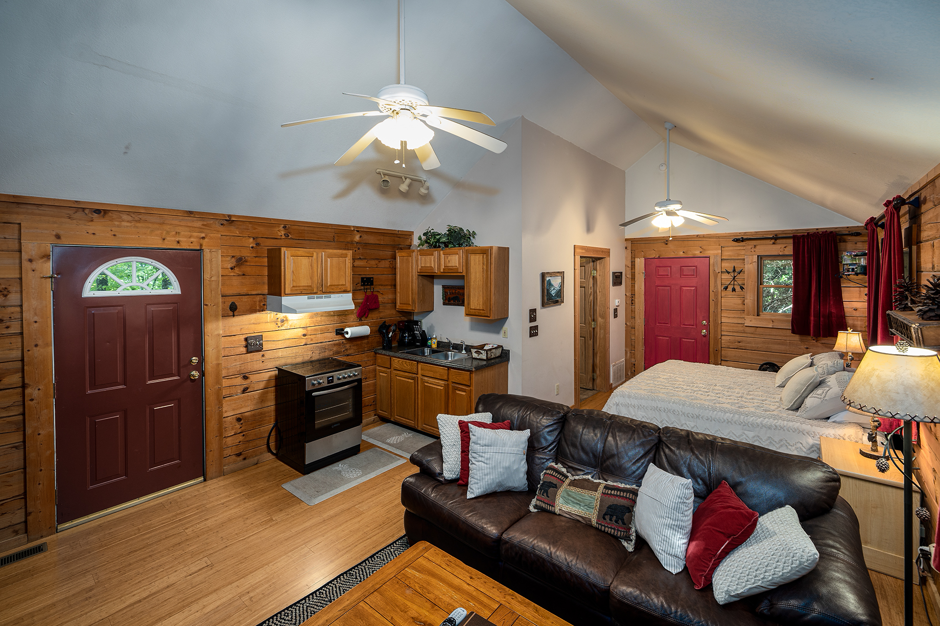 This romantic cabin for two sets the mood as soon as you step inside. Warm wood tones and woodland touches create a cozy and comfortable feeling. The openness of this floor plan makes sure you spend all your time together. The soft leather sofa sits in front of a flat screen TV. Ideal for snuggling up together and watching a favorite movie or show on satellite TV. The efficient kitchen is well equipped and you will find all you need for making dinner for two. A cozy table provides seating for a candlelight meal together. Across this room is the king size bed with plush bedding. A full bath with tub is located privately off the bedroom.
