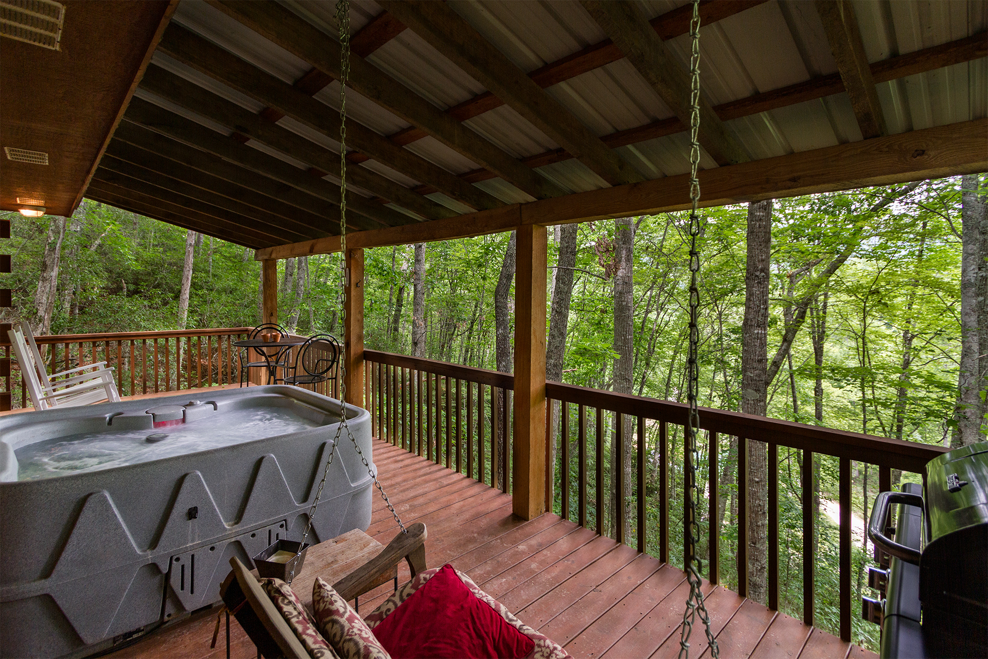 Squirrel Run is a cozy little cabin tucked away in the woods of the Great Smoky Mountains. The welcoming landscape draws you right in the front door, or down a couple of steps to the deck that leads you around the back side of the cabin. Peaceful and quiet, a comfortable space to sit at the small table and share a fresh cup of coffee in the morning air, sit close and cuddle on the porch swing, or kick back in the rocking chairs and unwind together. This covered deck also has a gas grill for making your famous mouth watering steaks. Should you prefer charcoal, that grill is located around the front. Also privately located here is a hot tub for setting the mood for a long romantic evening.