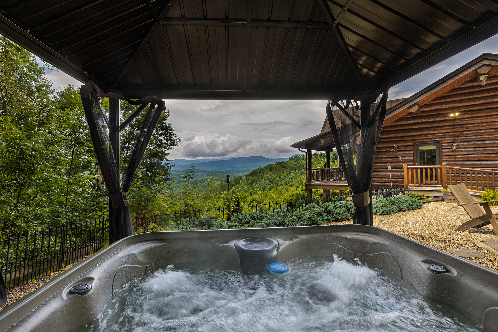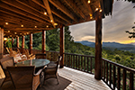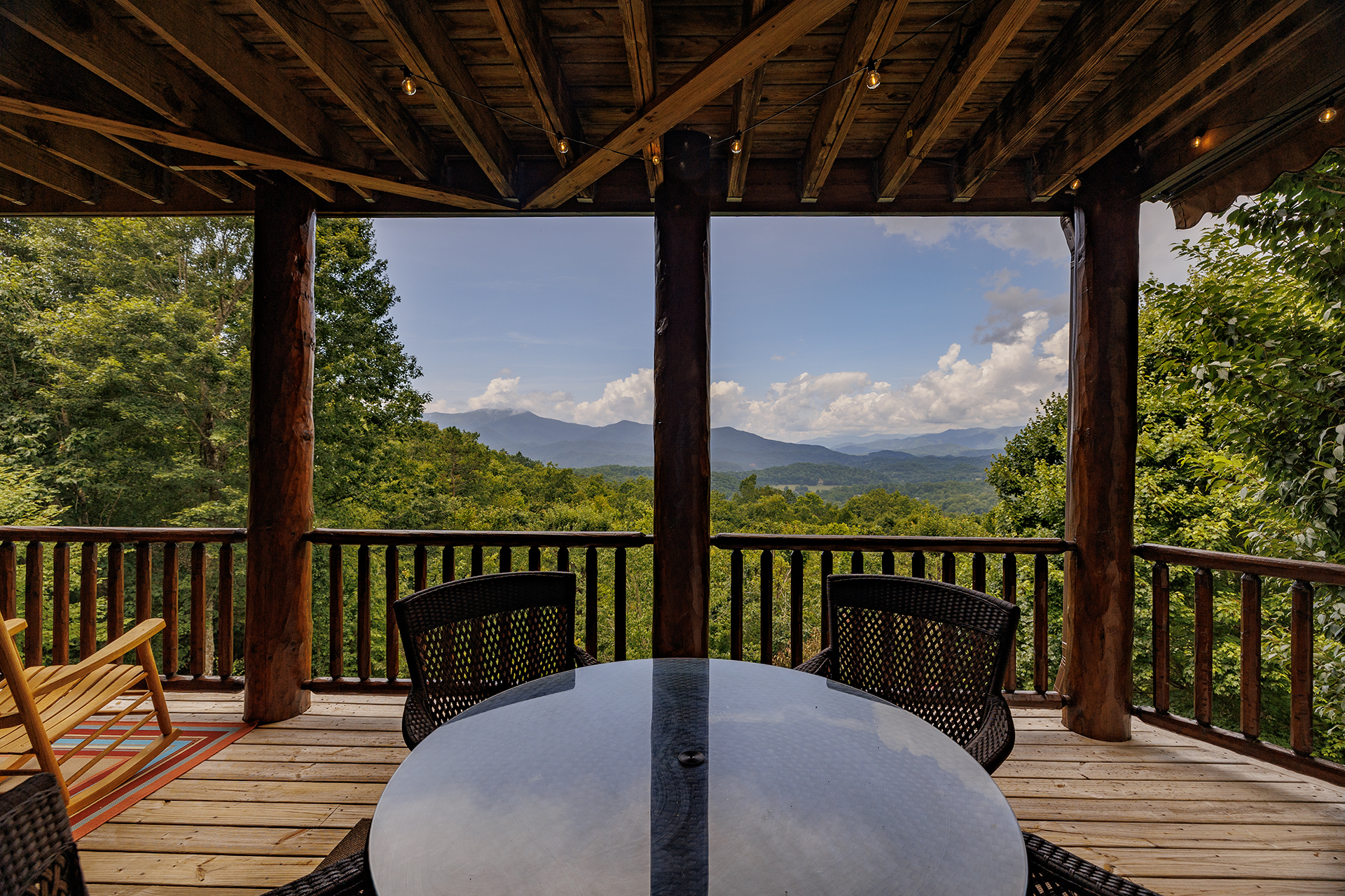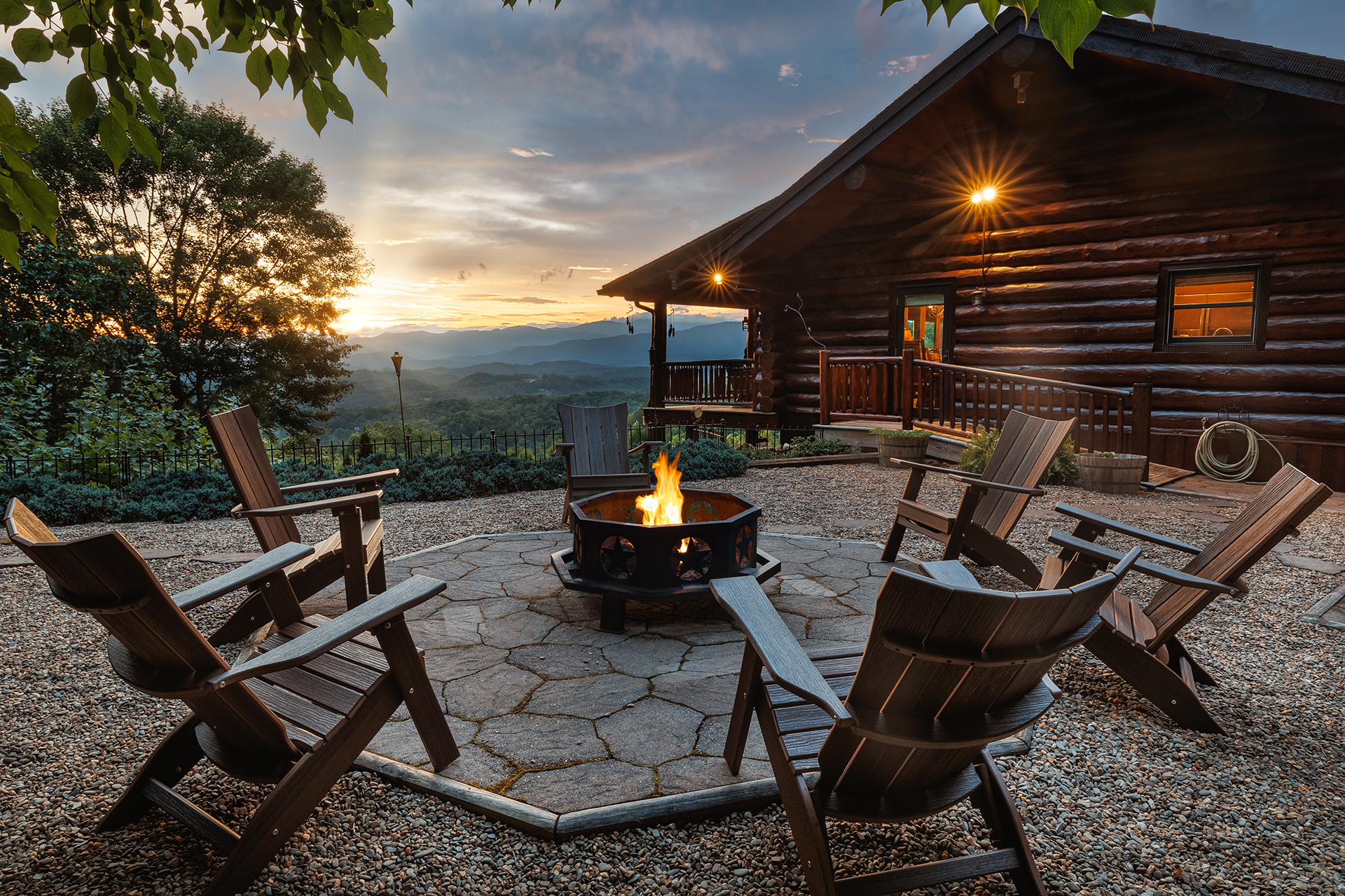 The fully paved roads to Story Lodge lead you to double drives- an upper that brings you under a towering, covered log entry, and a lower with access to the downstairs. Plenty of parking for all your guests. With a stacked, west-facing mountain view from upper and lower decks, prepare to be amazed at sunsets that are nothing short of masterpieces! When you are ready to head outside, the only obstacle will be deciding which space to select! Enjoy dinner on the upper deck at the comfortable 6 person dining table with swivel seats, or head over to the cushioned rockers with end table and coffee table, and chaise lounge. The lower deck features wooden rocking chairs with end tables and a four person table with cushioned seats. Outdoor lights strung up over the lower deck will provide the perfect backdrop to all your evening photos! The side area of the house features even more outdoor options, including a picnic table, fire pit with 6 adirondack chairs, and a hot tub, housed under a pergola with screen option- all of this with a direct mountain view!