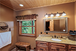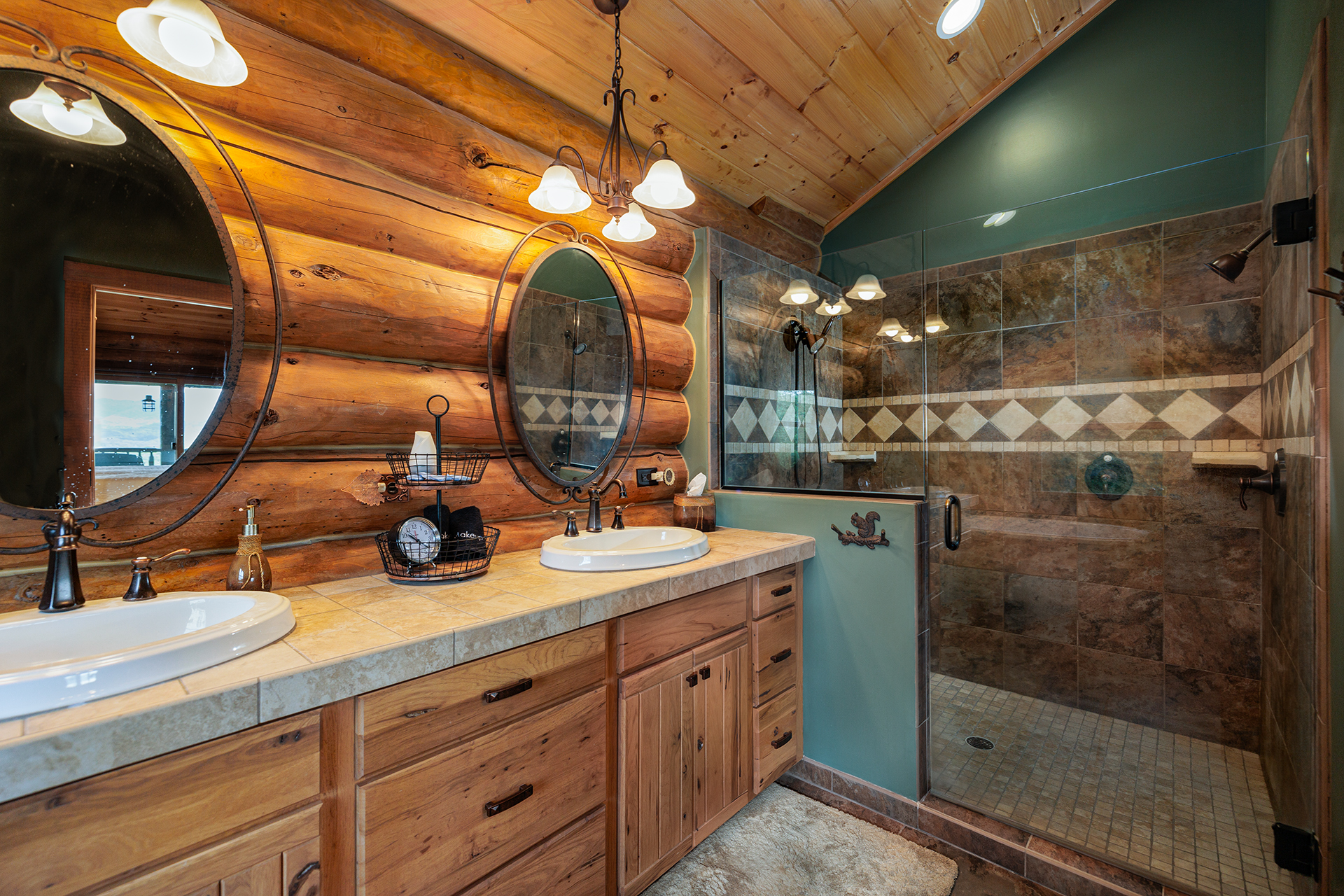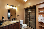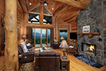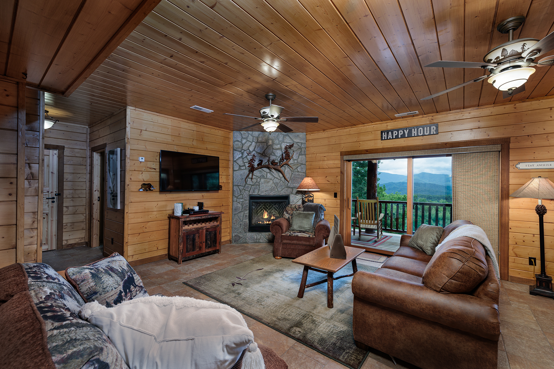 The lower level hosts a queen bedroom with memory foam and hickory log headboard, walk-in closet, and dresser. Directly across the hall sits a full bath with a walk in shower and large vanity. The lower King bedroom boasts a hickory headboard and footboard with memory foam mattress, an HD television, as well as an incredible mountain view through the sliding door. Another full bath with walk in shower and vanity is directly adjacent.